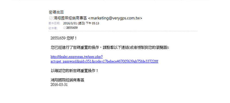 4. 系統會寄一封信「密碼找回」至您輸入的電子郵件地址