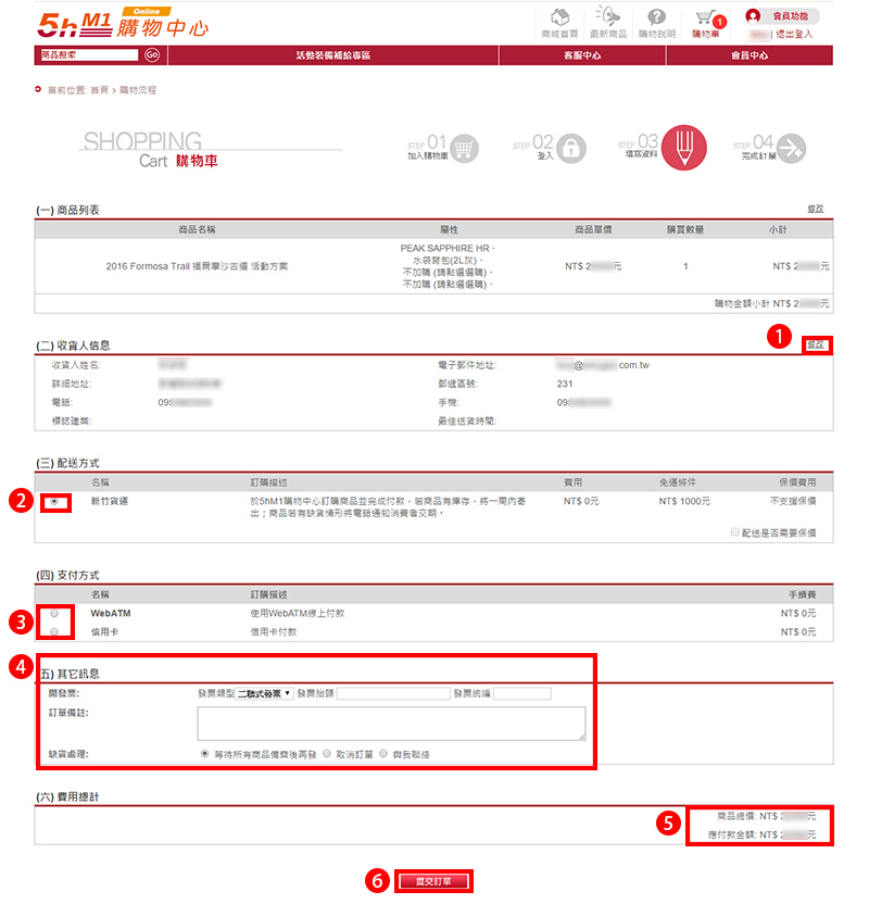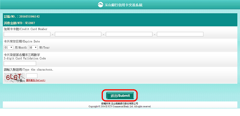 (1) 當付款方式選擇「信用卡付款」時:輸入您的信用卡資料→點擊「送出/Submit」即可完成交易