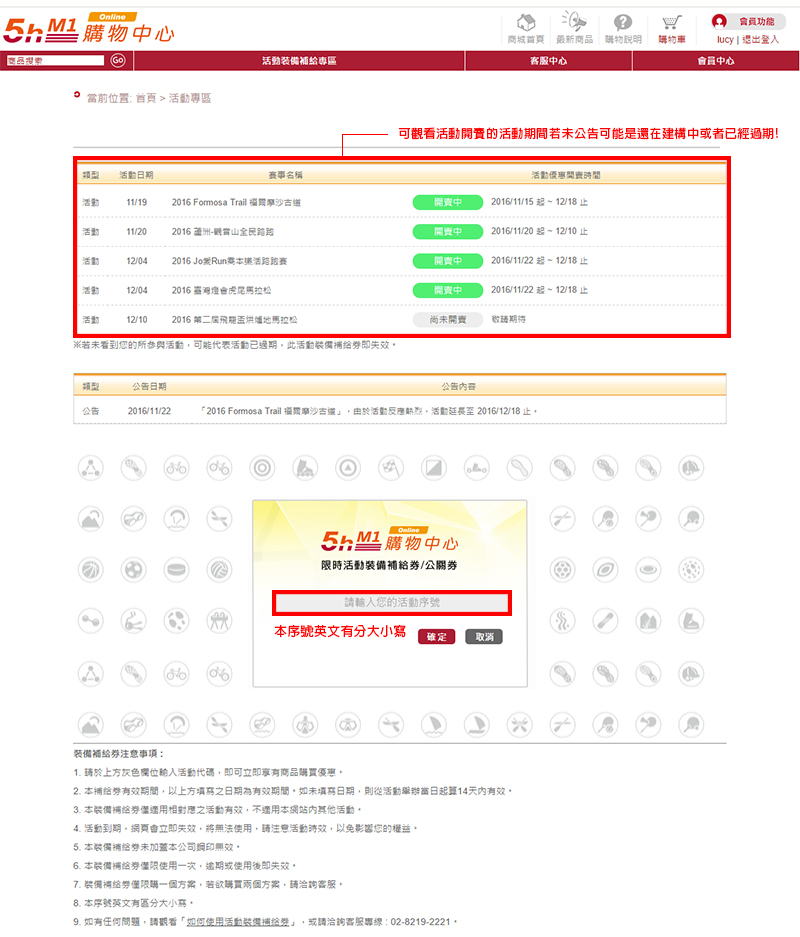 2.請在中間欄位輸入您的活動代號,請參考裝備補給券上的活動代號,並點選「確定」鈕進入。