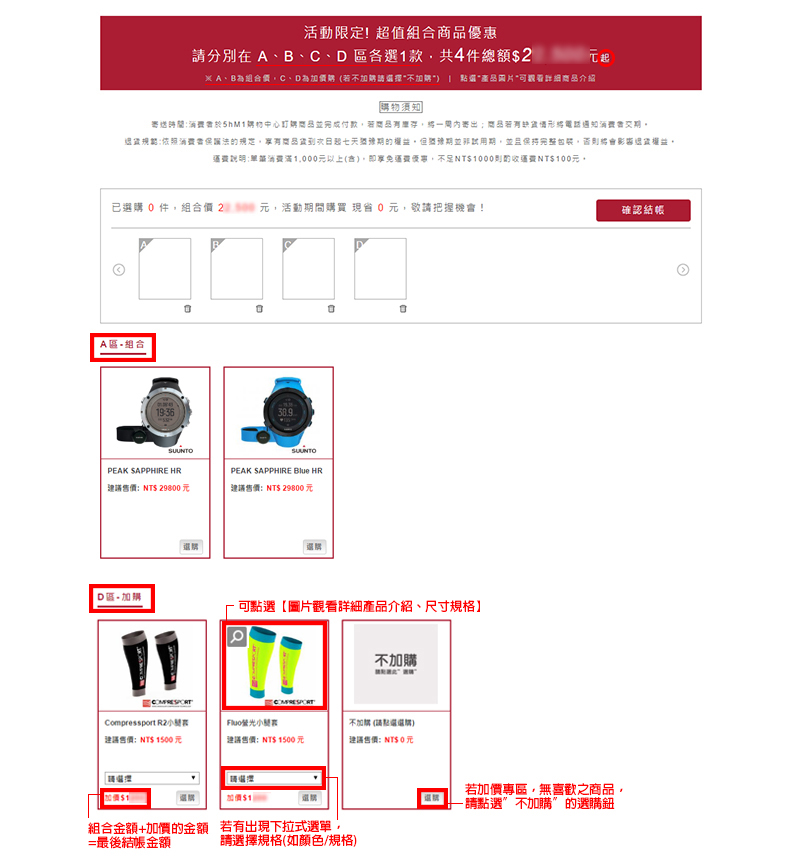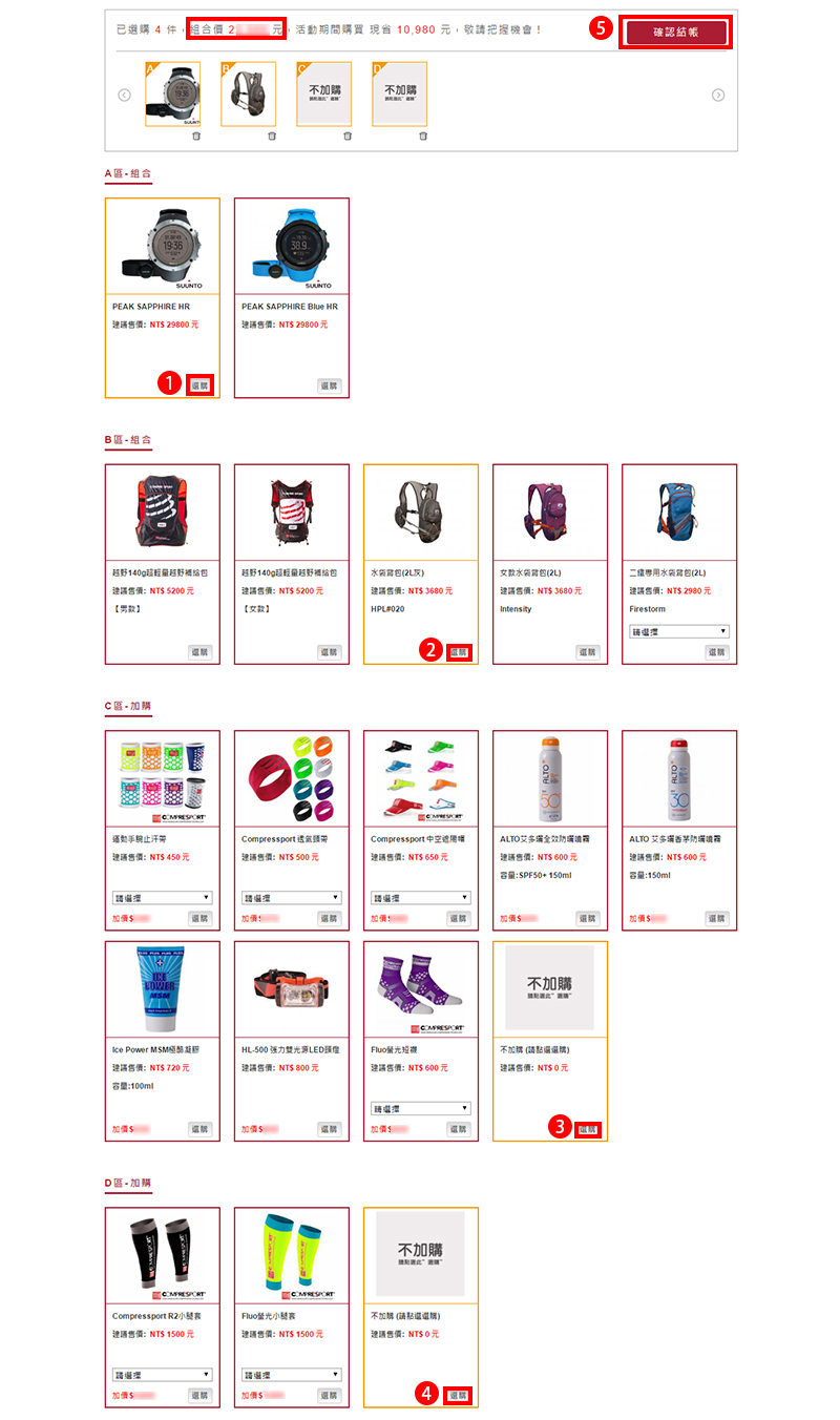5.請在各區選擇一款商品,並確認上方價格,確認無誤點選右方「確定結帳」鈕。