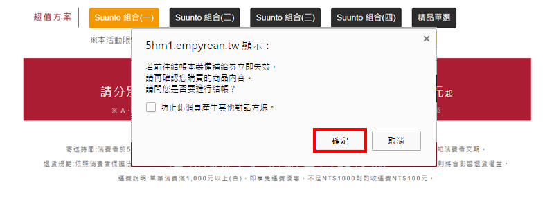 6.請注意!若前往結帳本裝備補給券立即失效。彈跳提示視窗:詢問您是否再次確認您的產品內容。